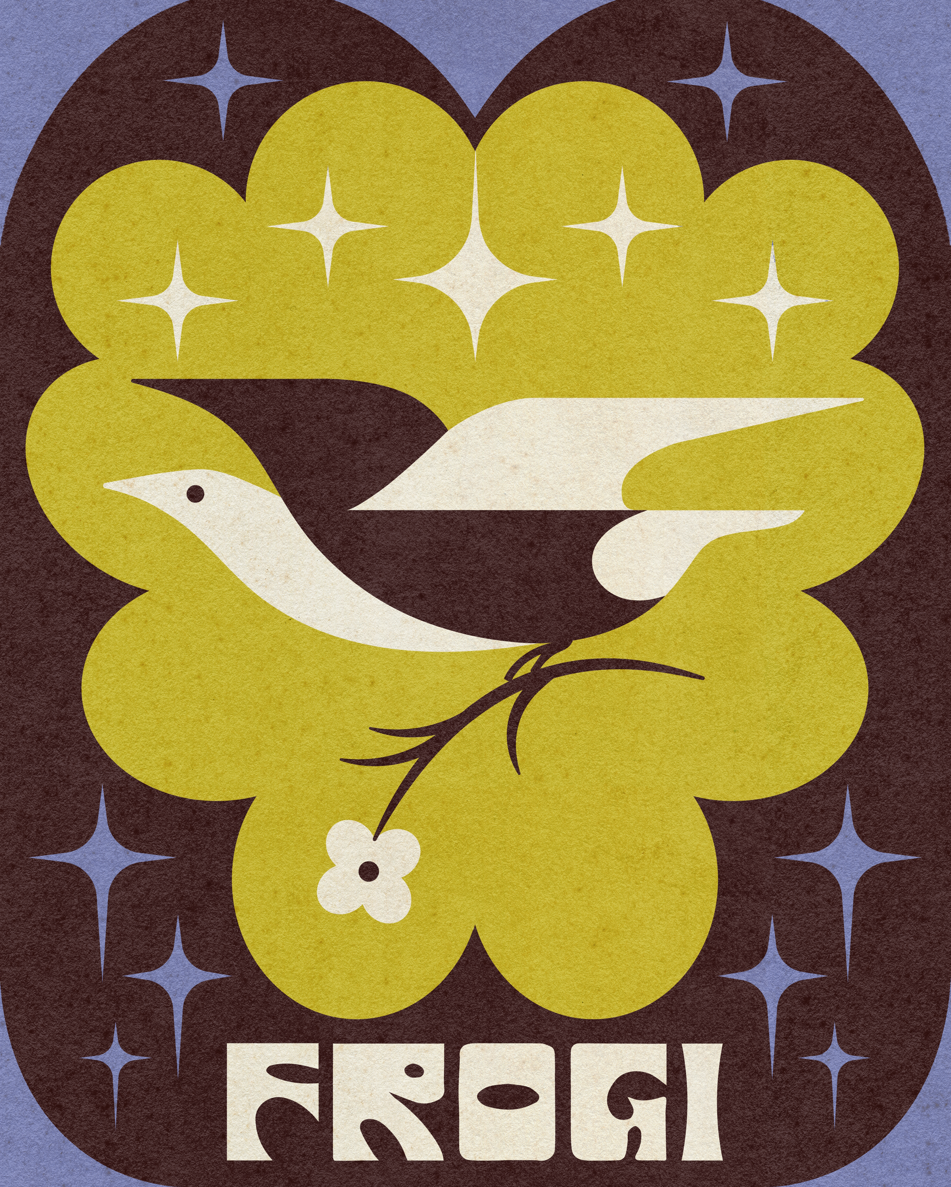 Artwork for LA-based musician, Frogi, for her SXSW merchandise. Inspired by the free-spirited nature of her new album, titled ‘sometimes i’m a warrior, sometimes i’m a little bird that can’t get off the ground,’ we created a graphic, color-blocked design featuring the silhouette of a bird and hand lettering.